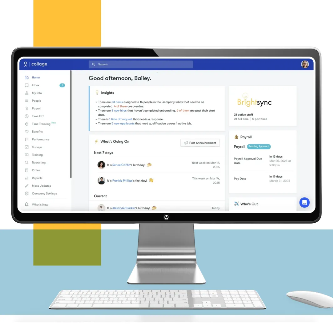 Introducing Collage: an easy-to-use digital platform that manages your time off, simplifies timesheets, helps you hire, enables performance reviews, and runs payroll. It’s like superpowers for your HR department.